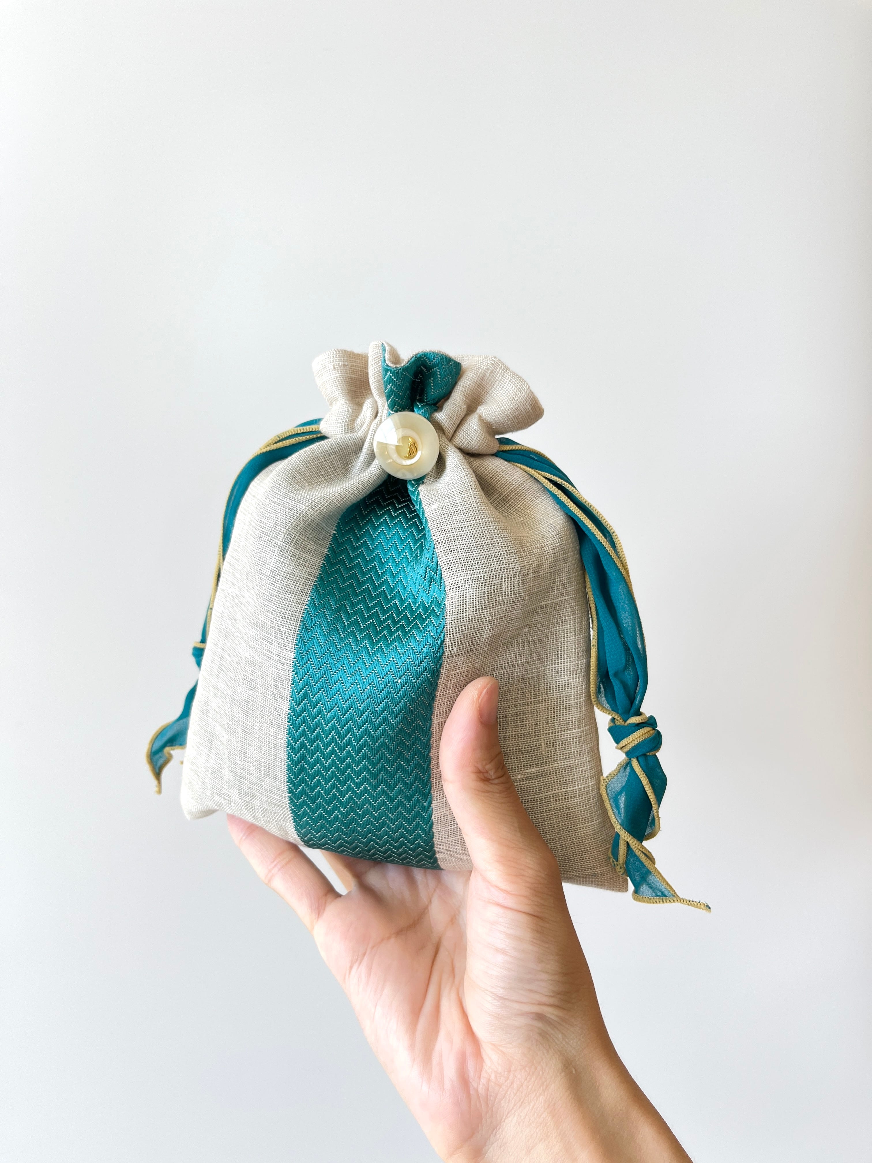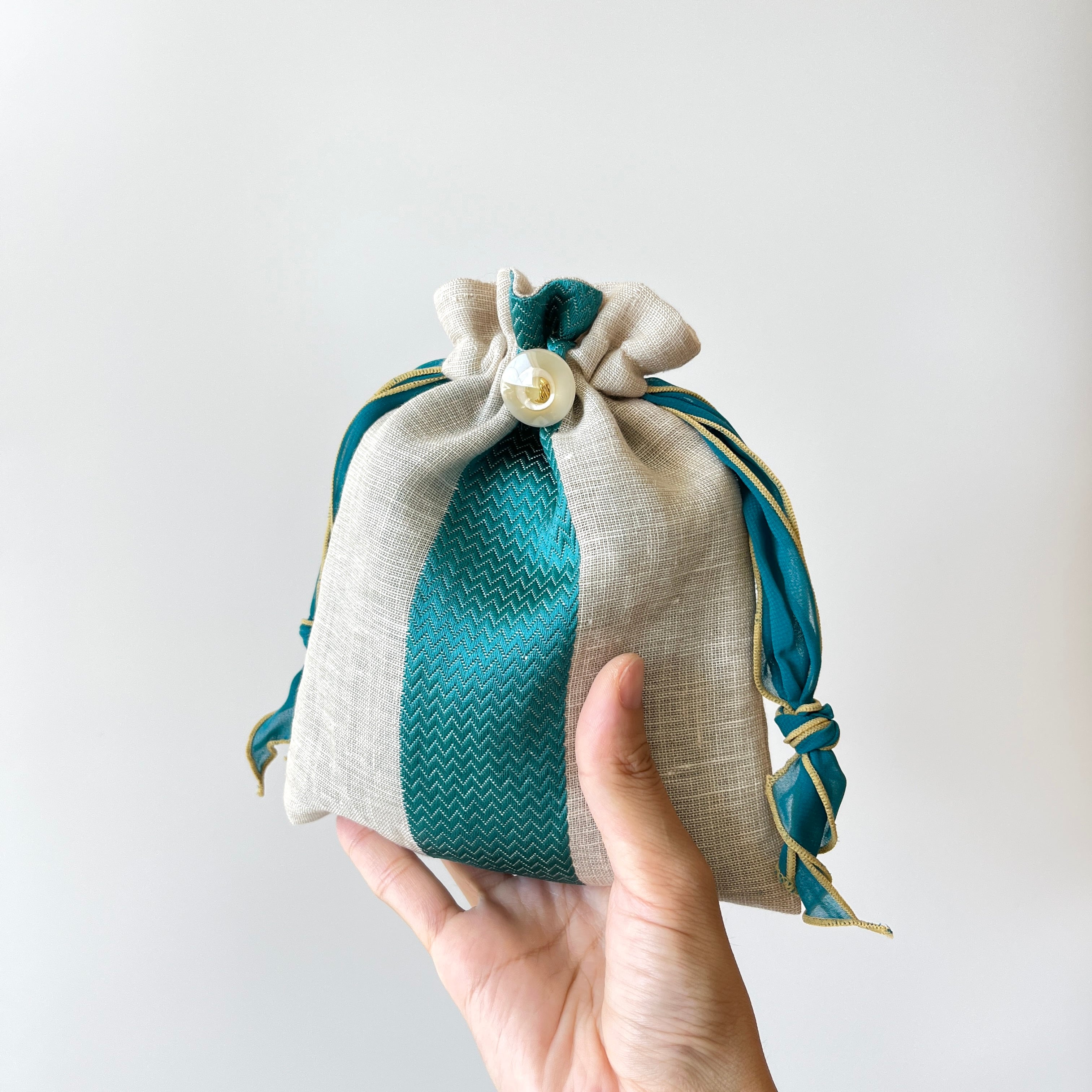 【エメラルド×ゴージャスライン】リネン×ジョーゼット生地のリボン巾着